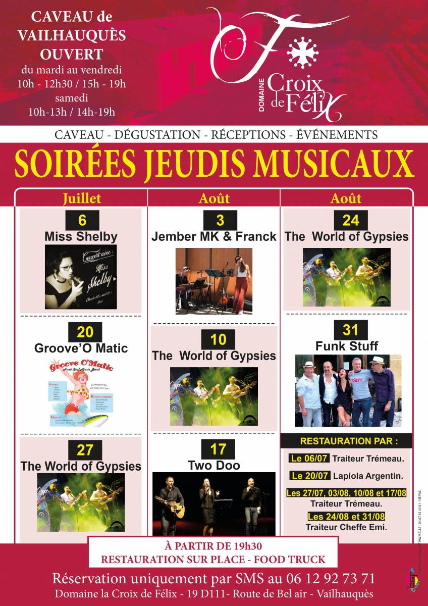 Venez prendre un bol d'air frais entre vignes et oliviers, au domaine Croix de Félix à Vailhauquès, à partir du 6 juillet 19h30, début du concert vers 20h. Vous pouvez retrouver le programme sur le site, Facebook, Instagram ou sur l'affiche devant le domaine. Nous vous proposons des groupes différents et très professionnels qui vous feront passer une agréable soirée. Du funk, du Jazz, Gypsies, variétés du moment, il y en aura pour tous les goûts!! Restauration très sympa sur place avec brasucade à l'apéro, un traiteur qui vous proposera du choix et des prix corrects. Vente de vin du domaine au verre ou à la bouteille, soda, café... Un lieu apaisant qui vous attends avec votre famille ou entre amis. N'hésitez pas à venir nous rendre visite. Nous serons ravis de vous faire découvrir ce lieu. Pensez à réserver à Sandrine au 0612927371